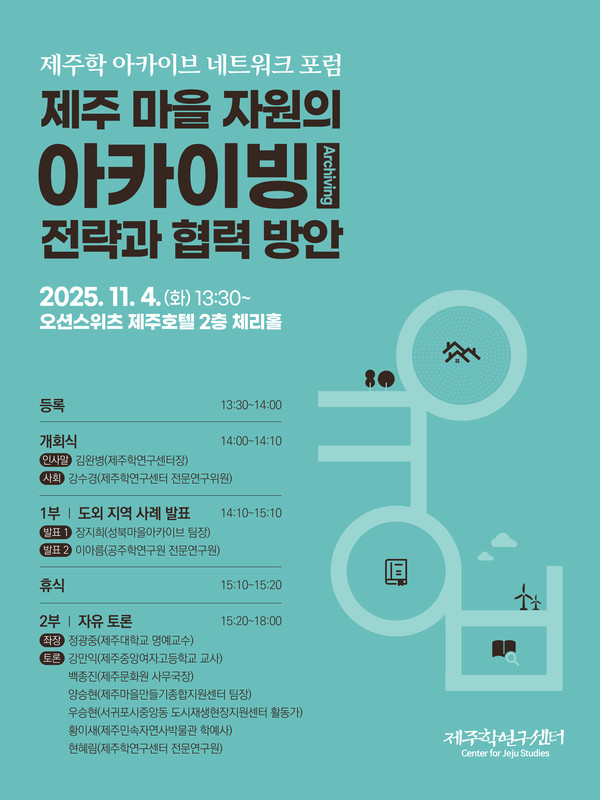제주학연구센터(센터장 김완병)는 오는 4일 오후 1시 30분, 제주시 탑동해안로 오션스위츠 제주호텔 2층 체리홀에서 ‘제주학 아카이브 네트워크 포럼: 제주 마을 자원의 아카이빙 전략과 협력 방안’을 개최한다.