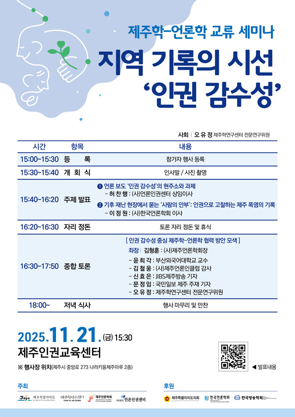 김완병 제주학연구센터장은 “제주학과 언론학은 도민의 삶을 보듬고 해법을 찾는 공동의 사명을 지닌 분야”라며 “이번 세미나를 기점으로 인권 감수성이 살아 있는 제주 공동체 연구를 더욱 확장해 나가겠다”고 말했다.