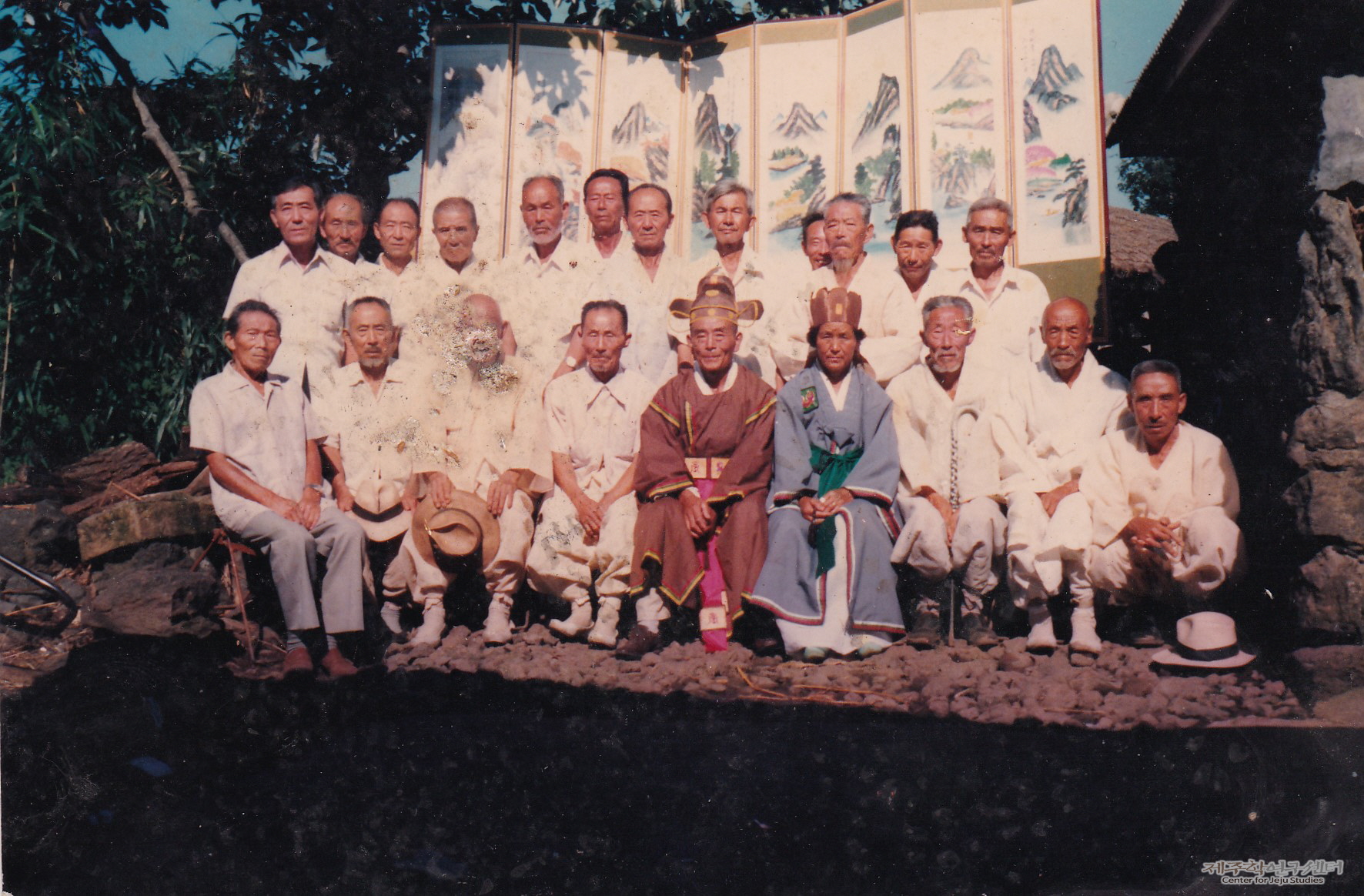 박화진 훈장댁 마당에서 촬영한 ‘훈장체’ 기념사진이다. 사진 앞줄 중앙에 박화진 훈장이 앉아 있고, 그 뒤로 사진 소장자 강홍종 씨의 아버지 故 강상룡 씨가 서 있다. 이들은 8폭 병풍을 배경을 삼아 섰고 박화진 훈장 부부는 수운교 복장을 하고 있다. ‘훈장체(증서)’는 만 60세가 되는 해 향교에서 수여하는 증서로 당시에는 환갑을 맞은 어르신들이 이를 받고 마을에서 잔치를 열었다고 한다.