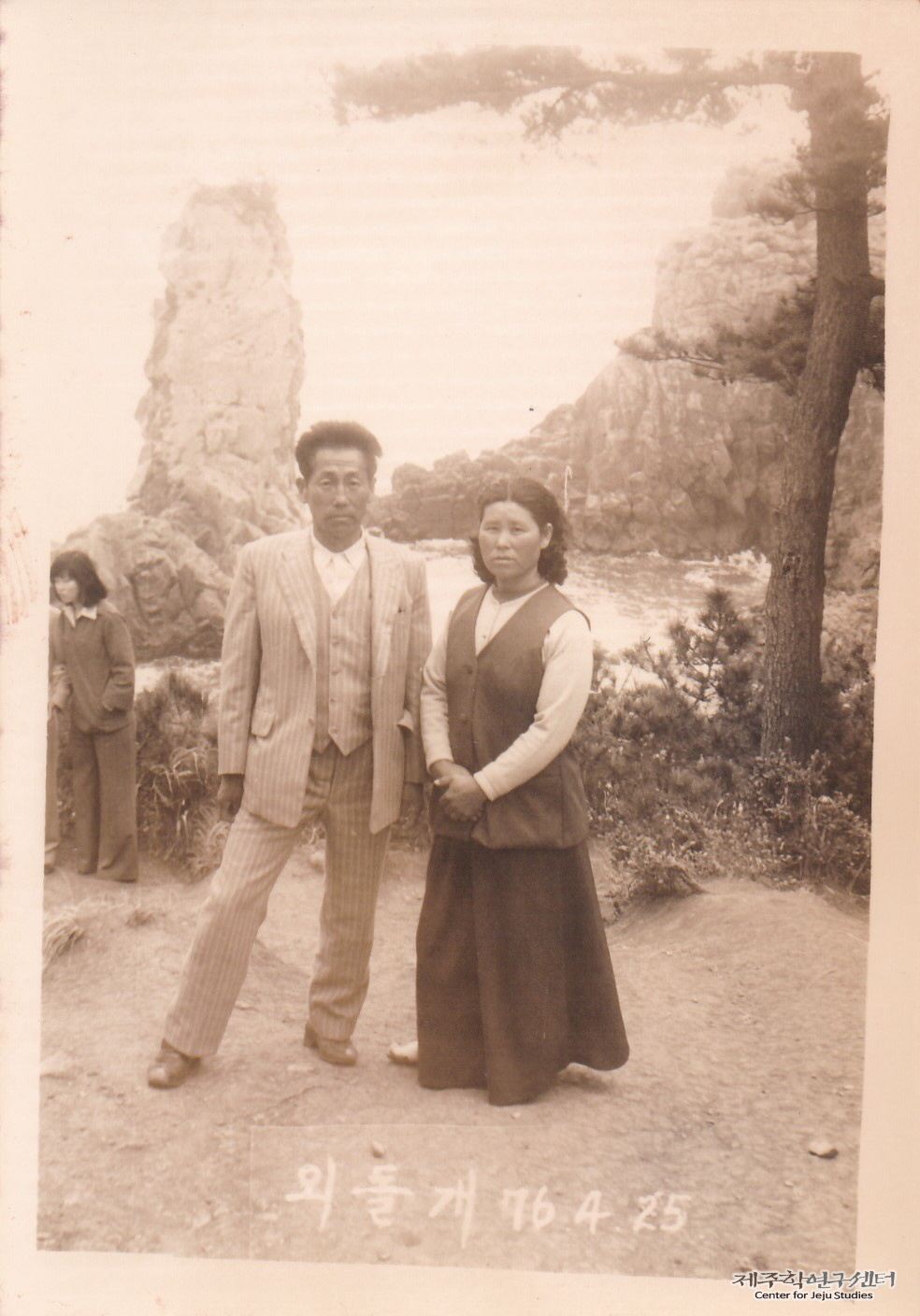 소장자 강남승 씨와 그의 아내가 서귀포 외돌개 앞에서 함께 찍은 사진이다. 강남승 씨는 마을에서 '부인회 지도자'로 활동하던 중 봄철 농한기를 맞아 마을 주민과 함께 버스를 대절하여 제주도를 관광하던 날이라고 한다. 당시 외돌개는 제주도 대표적인 명승지로 많은 관광객이 찾던 곳이었다. 현재와 달리 1970년대 외돌개는 절벽 가까이에서 보도록 개방되었다고 한다.