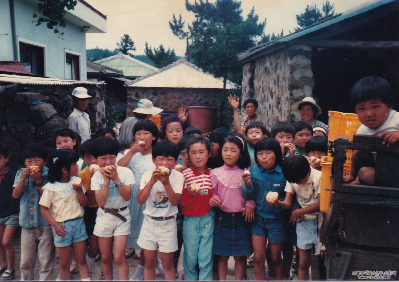 물메초등학교 학생들이 수산봉 야외 수업을 마치고 학교로 돌아가던 중 잠시 멈춰 참외를 나눠먹는 모습이다. 전경순 씨 가족들은 집 앞을 지나가는 아이들에게 깎은 참외를 나눠주고 있다. 아이들은 입안 가득 참외를 물고 있고 그 모습을 전경순 씨 부부와 시어머니가 흐뭇하게 바라보고 있다. 당시 시멘트를 섞어 벽을 쌓아 올리고 슬레이트로 지붕을 개량된 모습도 보인다.