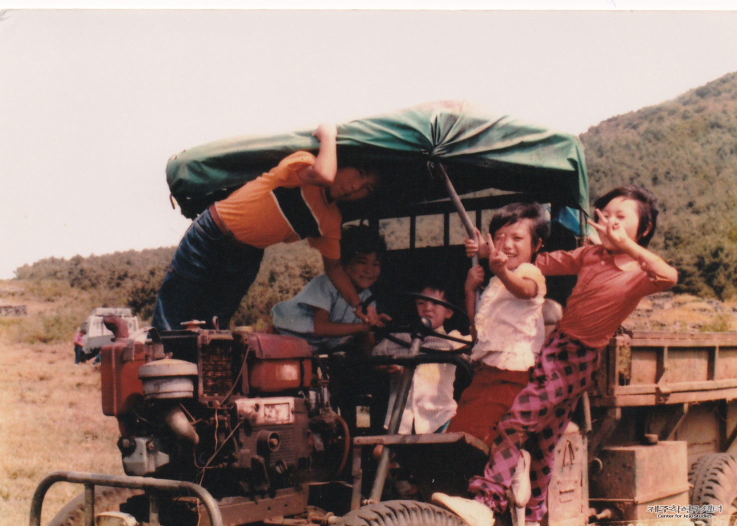 '벌초방학'을 맞아 전경순 씨 가족들은 한라산 중산간에 있는 조상 묘를 찾아 벌초하던 날 모습이다. 이날 온 가족이 경운기를 개조한 '딸딸이'를 타고 산세미오름, 아흔아홉골, 천아오름 등을 오가며 벌초하였다고 한다. 사진은 벌초 길에 천아오름에서 잠시 휴식하던 때 찍은 것으로 오른쪽부터 큰딸, 둘째딸, 막내아들과 조카 순으로 포즈를 취하고 있다.
