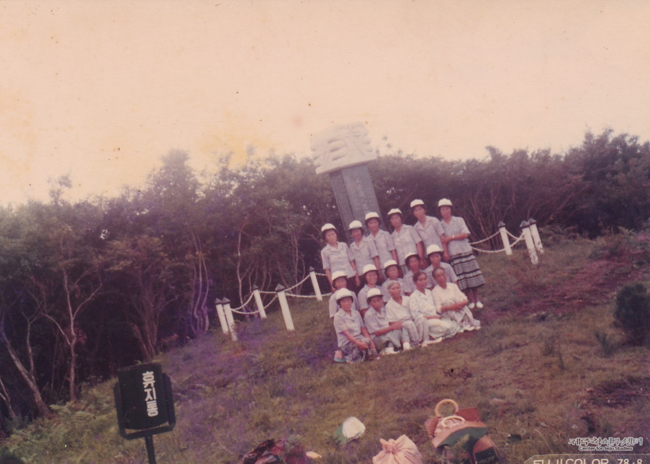 애월읍 수산리 당동 친목 모임에서 한라산 어리목 산장 인근으로 야유회를 떠나 남긴 기념 사진이다. 이날 당동 어르신들이 저수지 공동 작업을 끝내고 돈을 모아 나들이를 나섰는데 천왕사를 시작으로 선녀폭포, 어리목 산장까지 다녀왔다고 한다. 이날은 친목 몫돈으로 단정한 복장을 맞춰 입었다. 사진 속 오른쪽 세 분은 시어머니와 동네 어르신들이라고 한다.