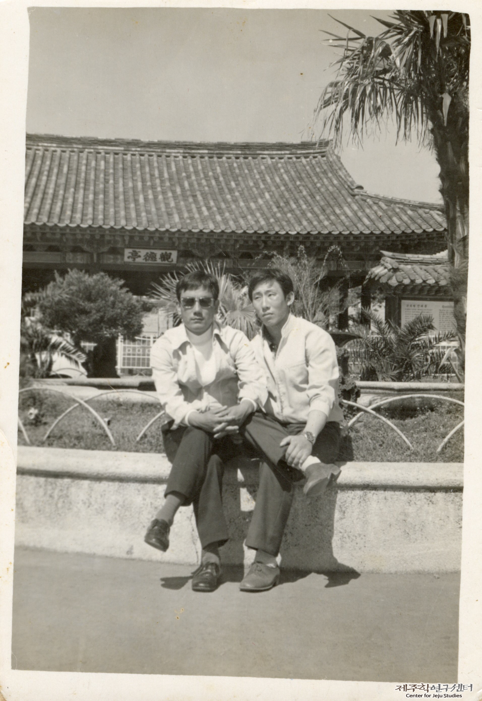 소장자 강옥순 씨 남편이 지인과 함께 관덕정을 배경으로 촬영한 사진이다. 당시 관덕정 주변엔 야자수가 높이 자라 있어 현재와 다른 풍광을 자아내고 있다. 남편(사진 왼쪽)은 선글라스를 끼고 포즈를 취하고 있다.