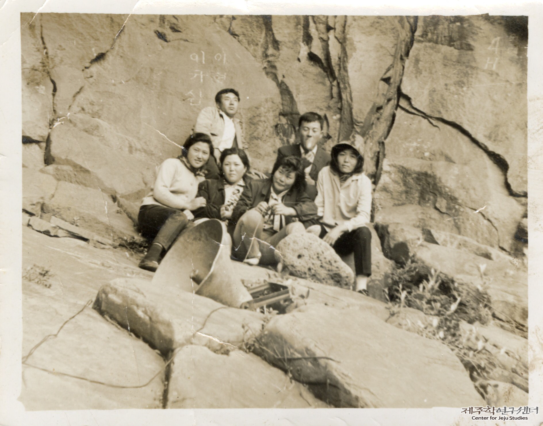 애월읍 수산리 4H 청년들과 박송자 씨(앞줄 오른쪽 3번째)가 산세미오름에 있는 '내창'에 모여 촬영한 사진이다. 사진 속 장소는 무수천 줄기로 '머리깍'에서 내려오는 뒤쪽 지점이라고 한다. 당시 청년들은 걸어서 애월읍 수산리부터 산세미오름까지 가는 데 3시간 정도 시간이 소요되었다고 한다. 갈 때는 대형 스피커와 배터리, 먹거리 등을 직접 들고서 이동했다고 한다.