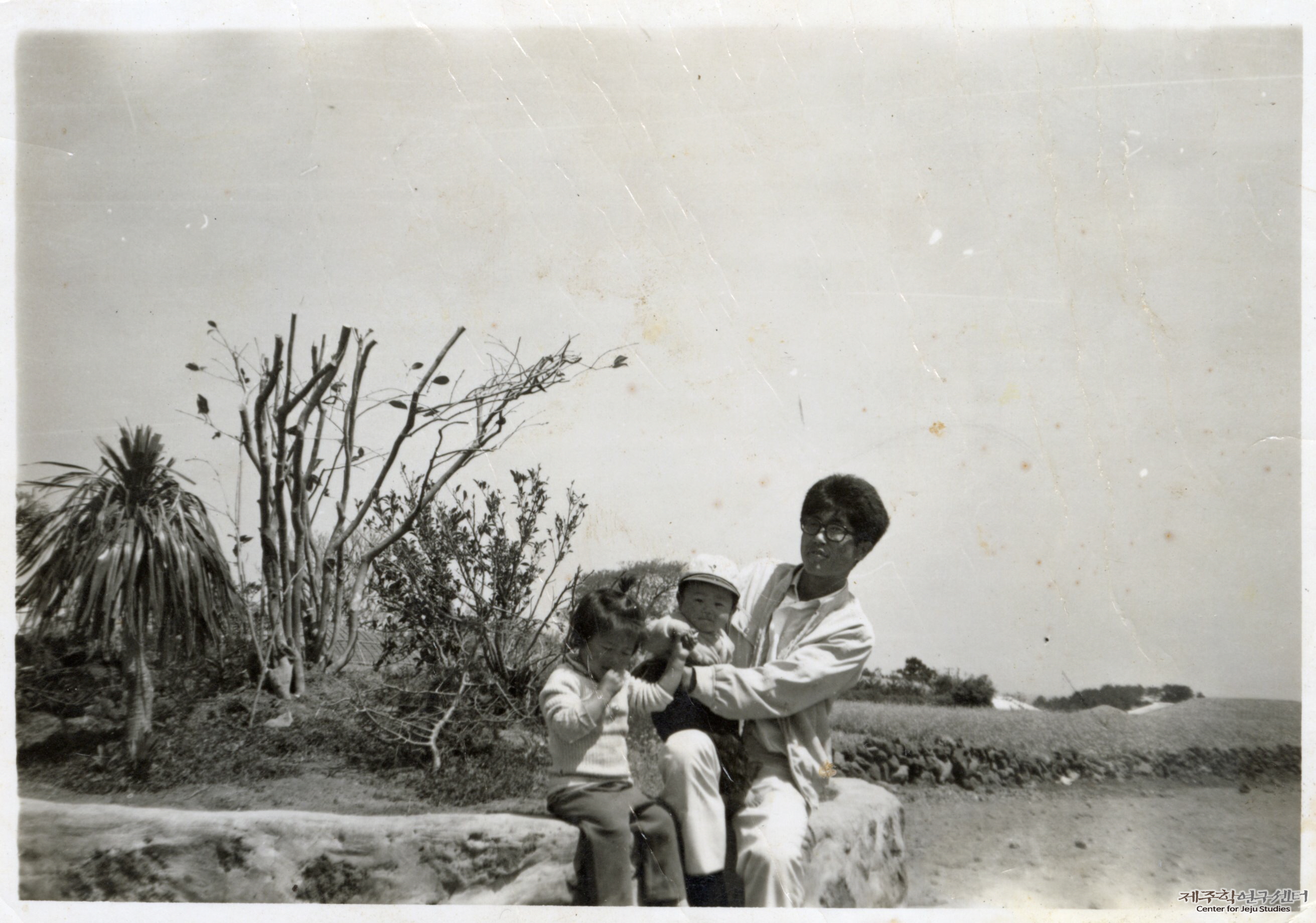 애월읍 수산리 중심부인 '네커리(사거리)'에서 찍은 사진이다. 양덕윤 씨와 어린 자녀들은 원형 로터리 턱에 앉아 있다. 사진 속 장소는 현재 수산리복지회관 앞 사거리다. 당시 네거리 중심에는 원형 로터리가 조성되었고 그 안쪽에 나무들을 심어두었다고 한다. 그곳에 마을 주민이나 아이들이 자주 모여 담소를 나누거나 놀던 공간이었다고 한다.