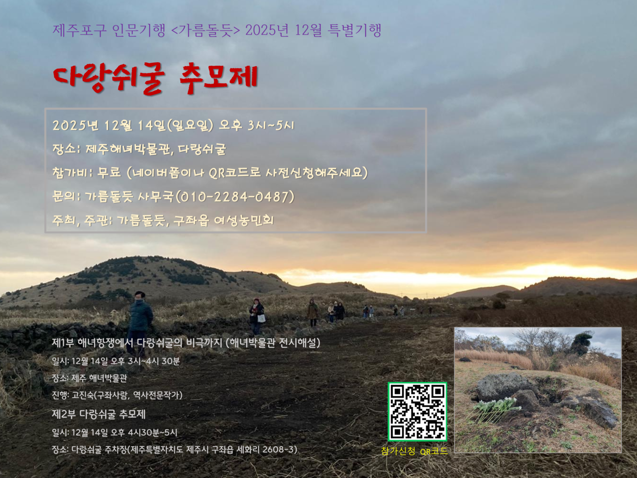 제주포구인문기행 모임인 <가름돌듯>(회장 고경대)은 ‘해녀항쟁에서 다랑쉬굴까지’라는 내용으로 12월 14일 해녀박물관 전시해설과 다랑쉬굴 추모제를 진행한다. 2024년 이후 두 번째 행사이다.