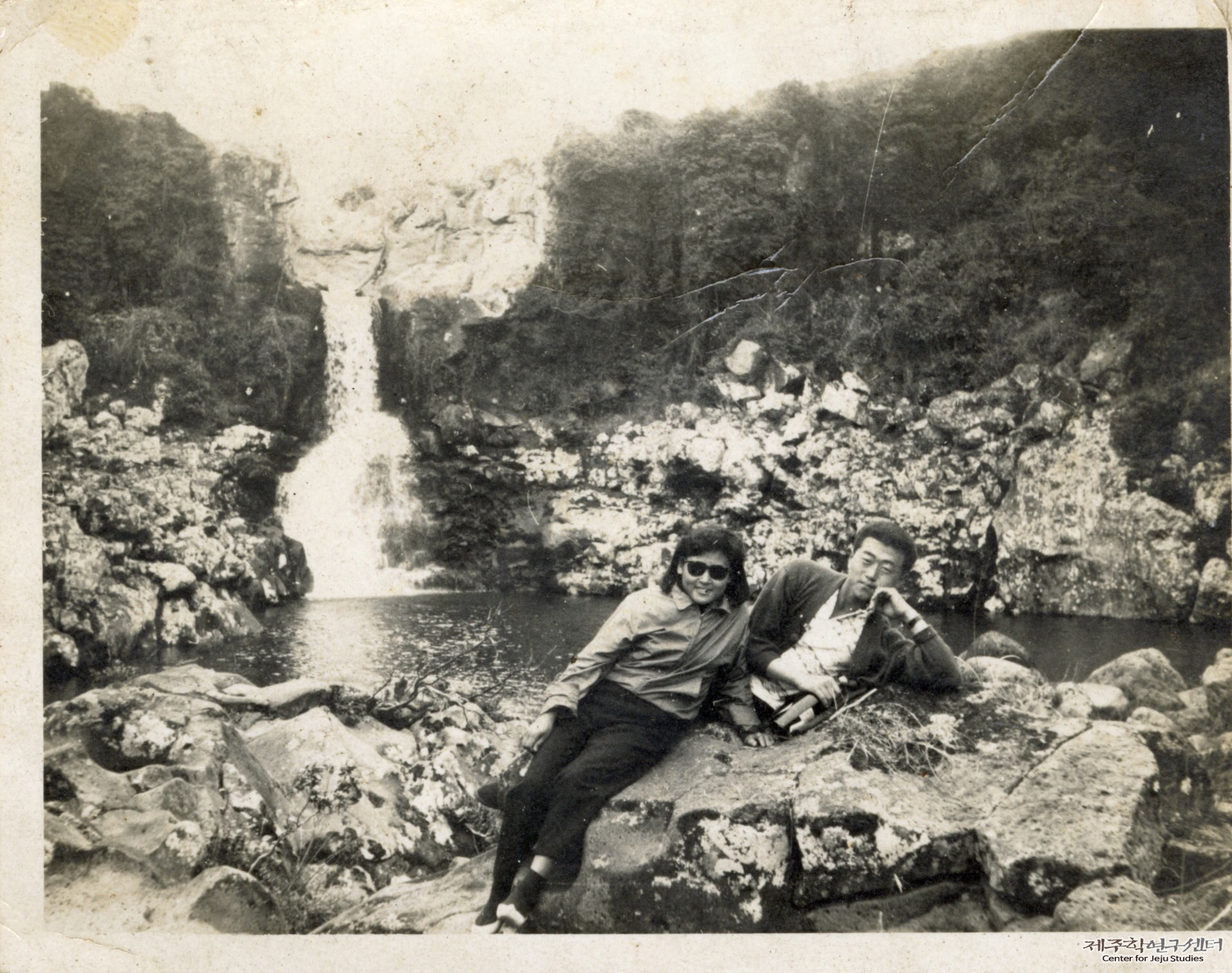 김원출 씨의 남편 강성호 씨가 친구와 함께 서귀포 천제연 제3폭포(추정)를 방문하여 촬영한 사진이다. 수량이 풍부하게 쏟아지는 폭포의 물줄기를 배경으로 두 사람은 암석에 편히 기대어 포즈를 취하고 있다. 천제연폭포 중 가장 하단에 위치한 제3폭포는 당시 청년들이 즐겨 찾던 야유회 장소 중 하나라고 한다.
