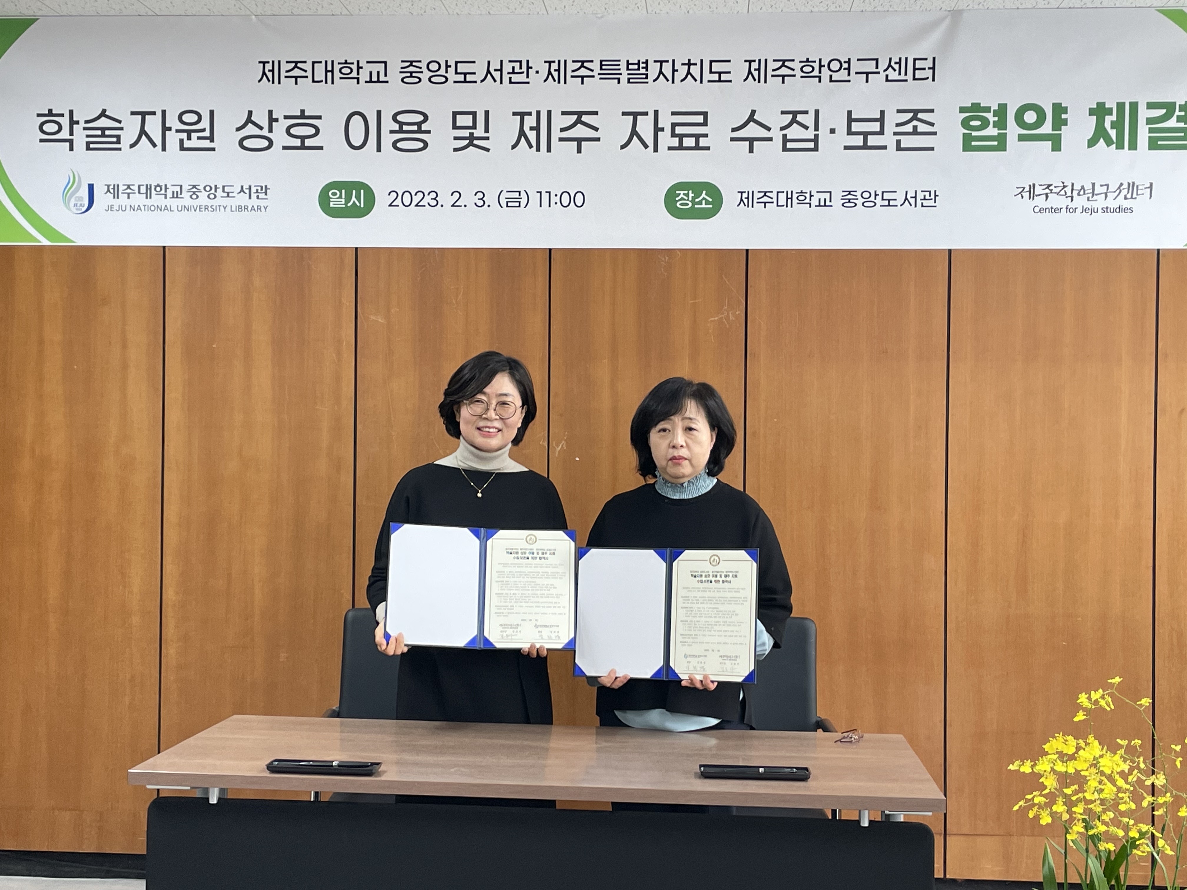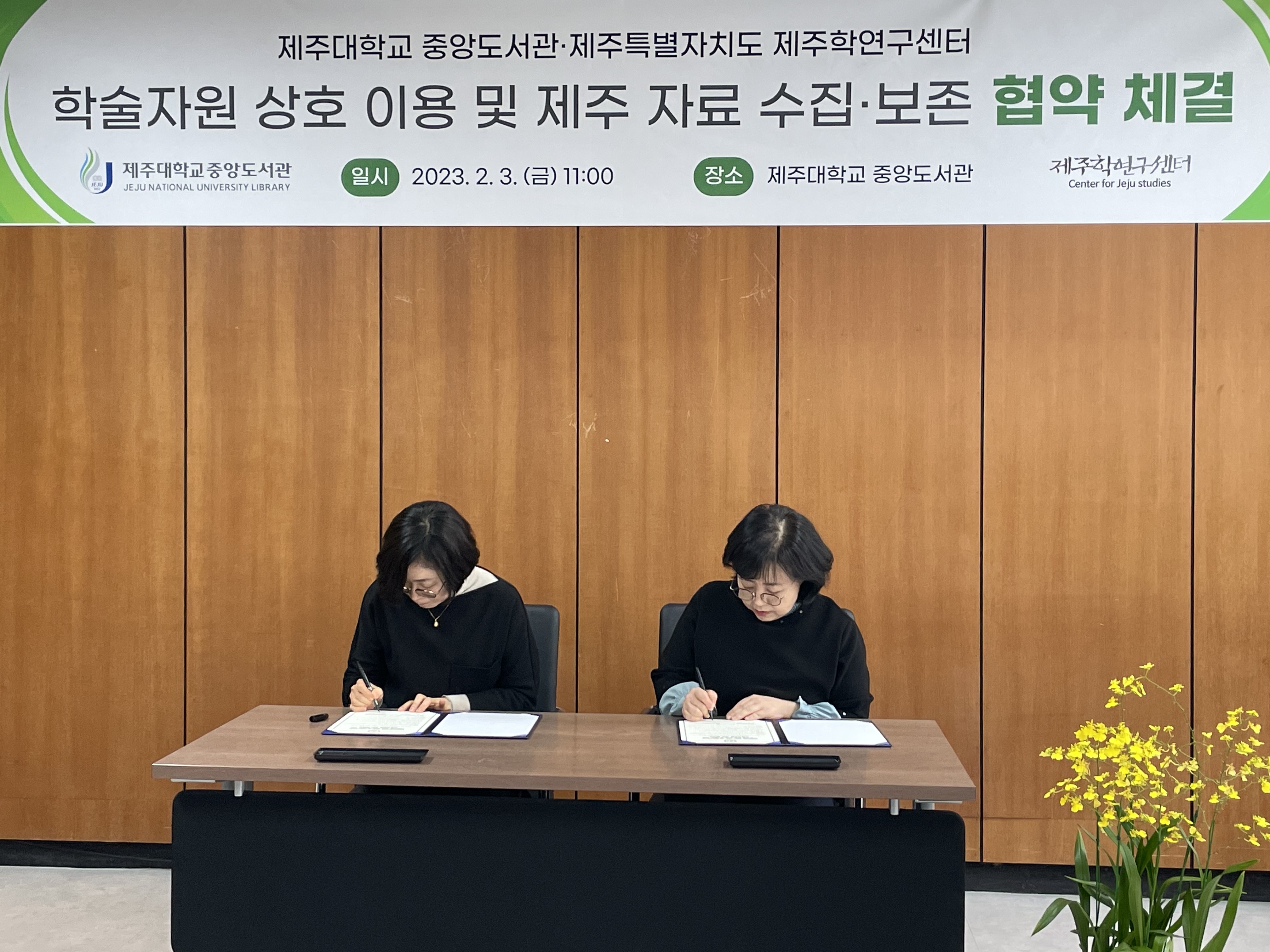 제주학연구센터(센터장 김순자)와 제주대학교 중앙도서관(관장 강희경)은 '학술자원 상호 이용 및 제주 자료 수집·보존'을 위한 업무 협약을 체결하였습니다.