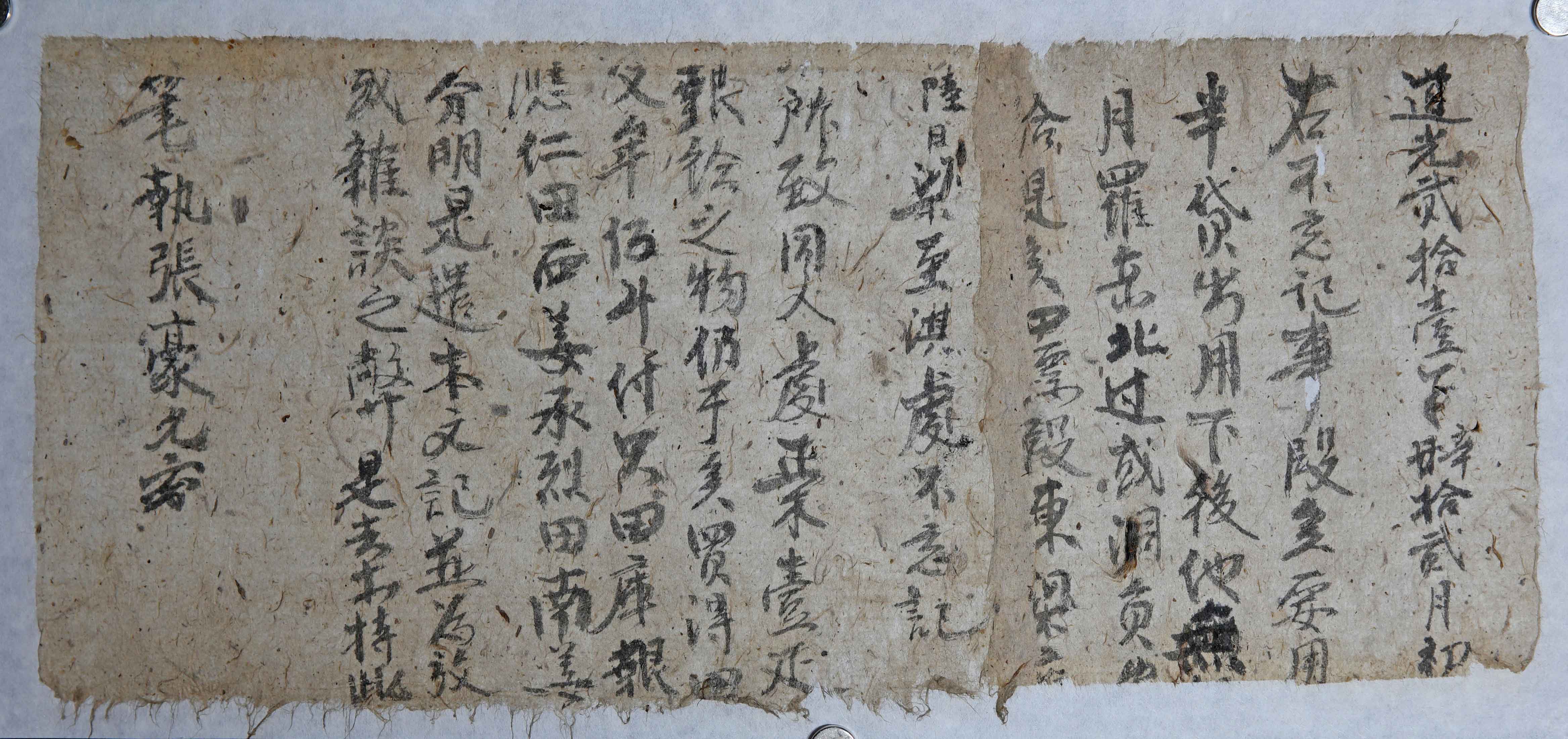 19. 不忘記(빚갚음을 농지로 대신한 증명서) 道光貳拾壹年辛丑拾貳月初陸日 梁至淇處不忘記. 右不忘記事段 矣要用所致 同人處正木壹疋 半 貸出用下 後他無報給之物仍于矣 買得田 月羅岳北邊或洞員 皮牟伍斗付只田庫 報合[/給]是矣 四標段東梁應仁田西姜承烈田南姜 낙장이 있음 分明是遣 本文記幷爲放 낙장이 있음 或雜談之弊是去等 持此筆執 張豪允 (수결) 도광 21년 신축(헌종 7년 1841) 12월 초6일 양지기에게 준 불망기. 이 불망기의 일은 내가 사용할 곳이 있으므로 동인에게 정목 1필 반을 빌려 사용한 뒤에 달리 갚을 물건이 없으므로 사들인 밭이 월라악 북쪽 가 혹동원(혹동 지경)에 있는 겉보리 닷마지기인 밭으로 보답하며 사방 경계표지는 동쪽에 양응인의 밭 서쪽에 강승렬의 밭 남쪽에 강 낙장이 있음 분명하며 본 문기와 아울러 팔(았으며) 낙장이 있음 혹시라도 잡담하는 폐단이 있거든 이 문기를 가지고 낙장이 있음 쓴 사람 장호윤 (수기) *이 문서는 위쪽와 아래쪽으로 나누어진 것 두 부분인데, 아래쪽 부분이 위쪽의 왼쪽에 붙였다. 그리고 윗부분의 2행이 낙장되었다. *月羅岳(월라악)은 감산리(안덕면) 1148번지 일대에 있는 오름이다. 안덕계곡을 끼고 있는 오름으로 북쪽으로 감산, 서쪽에는 화순, 남동쪽으로 난드르(대평) 등 행정구역으로는 3개 리의 경계에 걸쳐 있다. 심하게 침식을 받아 뚜렷한 형체를 알 수 없으나, 북동향 및 남서향의 3개의 말굽형 화구를 갖고 있는 복합형 화산체를 이룬다. 다른 이름은 월라봉(月羅峰)⋅월라산(月羅山)⋅이두봉(伊頭峰 이두어시오름)⋅대래악(帶來岳 다래오름⋅ᄃᆞ래오름) 등으로도 불린다.