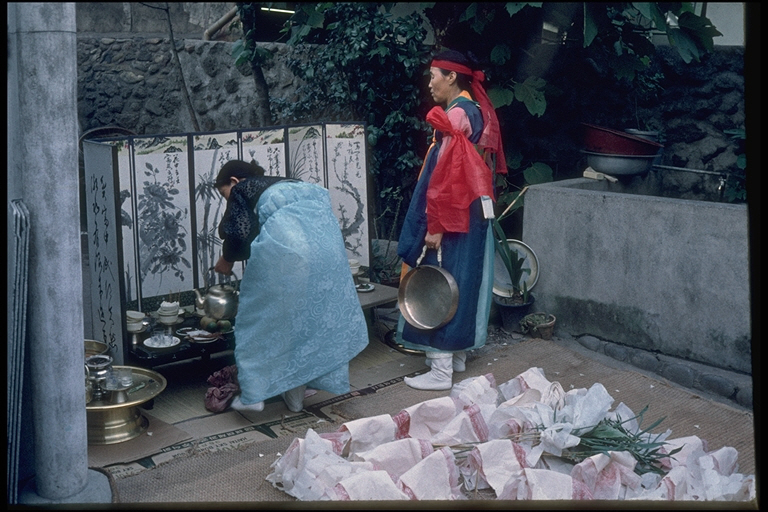 * 개요 : 제상[祭床]에 술을 올리고 심방은 대양(징)을 들고 바라보고 있다. 심방은 퀘지차림으로 머리에 이멍걸이와 왼쪽 팔에 빨간 천을 묶고 있다. 제비가 술을 올리고 나면 대양을 울리며 굿판을 벌릴 것이다. 제비는 굿을 할 때 심방의 심부름을 하는 자를 말한다.