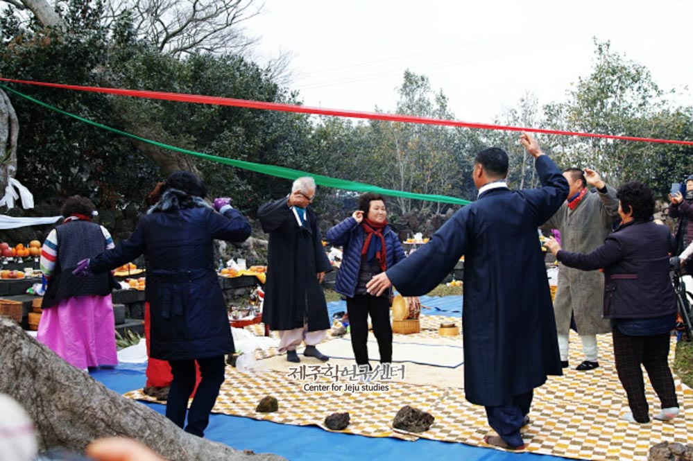 와흘리 신과세제(2018년) 마을사람들이 신자리에 나와 석살림 제차를 하는 모습