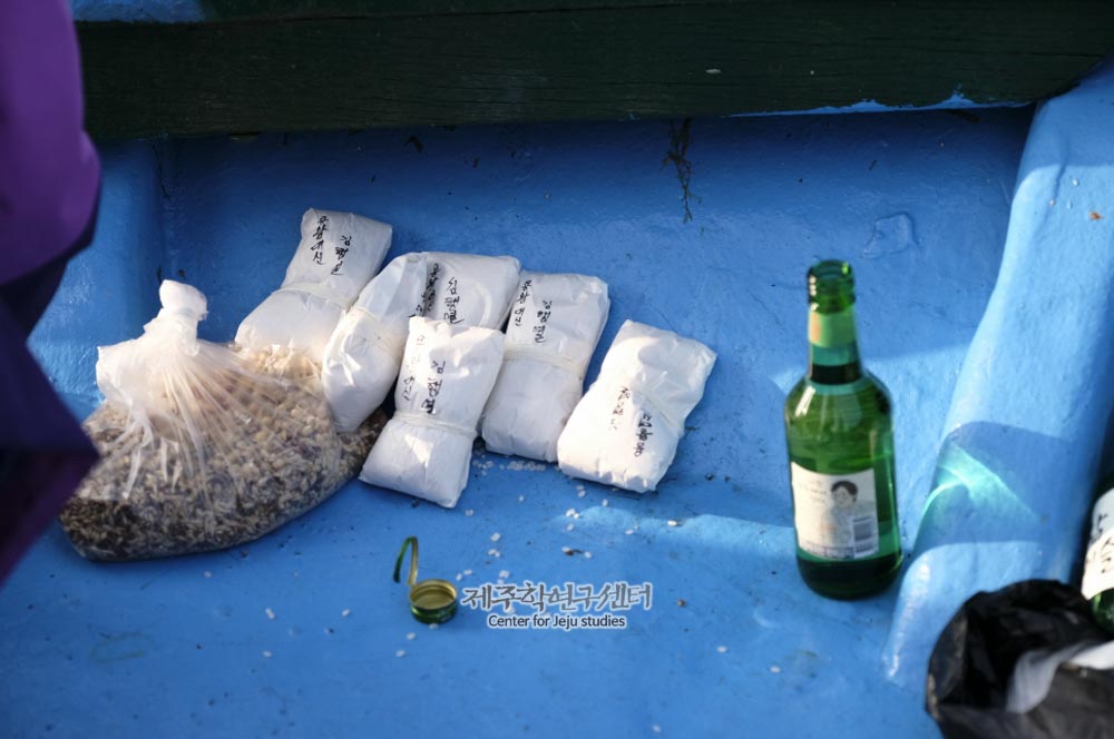 [장면설명] 지드림과 씨드림을 하기 위해 준비한 제물이다. [공통설명] 영등굿은 해마다 음력 2월 초하루와 열나흘 사이에 제주도 해안가 마을의 당에서 영등신을 맞이하여 풍어 및 해상안전과 해녀들의 채취물인 소라‧전복‧미역 등의 풍성을 기원하는 굿이다. 주로 해녀 및 어업, 선박업자의 부녀자들을 중심으로 연행되는 영등굿은 봄을 맞는 문턱에서 행해지는 계절제로서의 의미가 있다. 영등굿은 내방신으로서 풍우신, 어업신, 해신, 해산물증식신 등으로 관념된다. 신명은 ‘영등’ 또는 ‘영등할망’이라 하고, 제명은 영등굿이라 한다. 굿에서는 ‘영등하르바님, 영등할마님, 영등 좌수(座首), 영등 벨감(別監), 영등 호장(戶長)’ 등 여러 관직명이 붙어 나와 영등신이 관속을 거느리고 오는 것으로 되어 있고, 제명도 마을에 따라 ‘영등맞이’, ‘영등손맞이’, ‘영등제’ 등으로 불려진다. 영등굿 신화로는 외눈박이나라설과 강남천자국설 두 가지가 전해지고 있다. “영등할망은 2월 초하루에 강남천자국 또는 외눈배기섬에서 구좌읍 우도로 제주도에 들어와서 바닷가를 돌면서 미역씨, 전복씨, 소라씨, 천초씨 등을 뿌려주어 해녀채취물을 풍성하게 해주고 14일에 다시 우도를 거쳐 본국으로 돌아간다.”는 이야기이다. 이 신앙은 제주도 뿐 아니라 한반도 일대에 분포하며, 그 신명은 ‘영등할만네·영등할맘·영등할마니·영등할마시·영등바람·풍신할만네·영등마고할마니’ 등으로 불리고 있으며 주로 풍신(風神)으로 신앙한다고 전해진다.