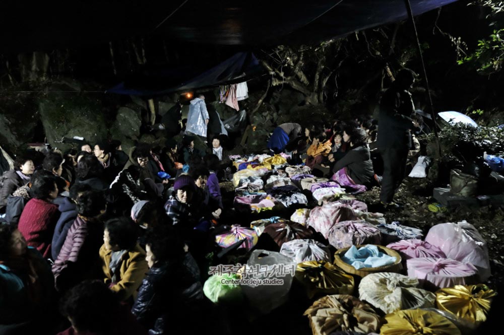 [장면설명] 가시리 본향 구석물당 신과세제에 제를 지내러 온 마을 사람들과 개별 의례에 사용할 제물들의 모습이다. [공통설명] 신과세제는 마을의 본향당에서 매년 정월에 신에게 새해를 맞이하여 과세(過歲)를 드리는 의미로 벌이는 굿이다. 그 어원은 ‘신-’은 일반어휘와 구별하기 위하여 무속에서 흔히 덧붙이는 접두사이며 과세는 한자어 ‘過歲’로 과세문안(過歲問安)의 뜻이다. 가시리 본향 구석물당의 당신명은 ‘구석물 열뇌화주 삼천백메또, 일뤠당신’이다. 한라산계 산신, 토산계 신으로 다신합좌형 남녀 다수 신이 좌정한 형태이다. 직능은 생산(生産), 물고(物故), 호적(戶籍), 장적(帳籍)이다. 제일은 신과세제는 정월 그믐에 하고 초ᄋᆢ드레에 제를 지낸다. 당신으로 남신은 송당 당신계의 산신이고, 밖에 모신 여신은 토산리에서 가지 갈라다 모신 토산계의 일뤠할망인 듯하다.