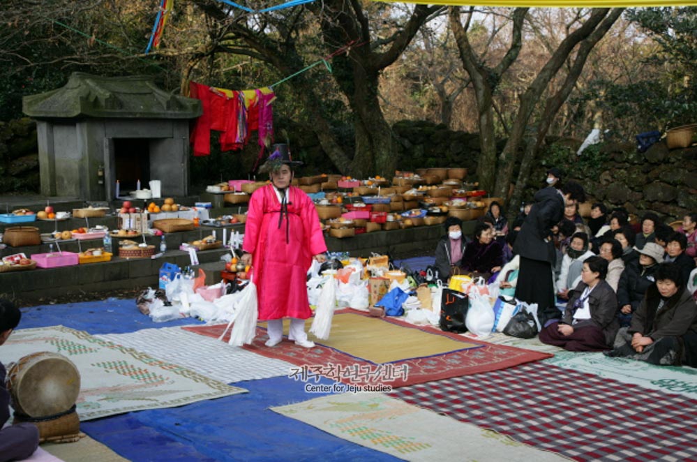 [장면설명] 정태진 심방이 초감제 제차를 하는 모습이다. [공통설명] 신과세제는 마을의 본향당에서 매년 정월에 신에게 새해를 맞이하여 과세(過歲)를 드리는 의미로 벌이는 굿이다. 그 어원은 ‘신-’은 일반어휘와 구별하기 위하여 무속에서 흔히 덧붙이는 접두사이며 과세는 한자어 ‘過歲’로 과세문안(過歲問安)의 뜻이다. 송당리 본향 웃손당 당오름 백주할망당의 당신명은 ‘웃손당 금백주 할망’이다. 송당계 모신(母神)으로 좌정형태는 독좌형이고 여신 혼자 좌정한 형태이다. 직능은 생산(生産), 물고(物故), 호적(戶籍), 장적(帳籍)이다. 제일은 신과세제 음력 1월 13일, 영등손맞이 음력 2월 13일, 마불림제 음력 7월 13일, 시만곡대제 음력 10월 13일이다. 제물로는 육류를 쓰지 않는 것이 특징이다. 당신화의 내용은 “육지에서 들어온 백주또와 제주 태생 소로소천국이 부부가 되어 사는데 백주또의 권유로 농사를 짓게 된다. 어느날 소로소천국은 배가 고파 농사 짓던 소를 모두 잡아먹어버린다. 이 사실을 안 백주또가 화가 나서 별거를 하게 된다. 백주또와 소로소천국 사이의 자식들이 제주도 곳곳에 당신으로 좌정하게 된다.”는 이야기이다.