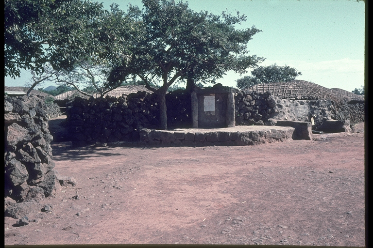 * 개요 : 마을 올레 입구에 폭낭 아래 댓돌이 있고 그 위에 방문석(榜文石)이 만들어져 있다. 댓돌은 마을 중심부에 만들어 주민들이 모여 쉴 수 있는 정자와 같은 것이다. 그래서 방문석을 설치한 것 같다. 방문이라는 것은 어떤 일을 널리 알리기 위하여 사람들이 다니는 길거리나 많이 모이는 곳에 써 붙이는 글을 말한다. 방문석은 마을의 행정적인 고지 또는 경조사를 알리던 게시장의 역할을 한다. 비가 내려도 젖지 않도록 자연석으로 지붕을 만들었다. 마을에서 어떤 알림 내용을 써 붙였을까. 종이 한 장이 붙여 있다.