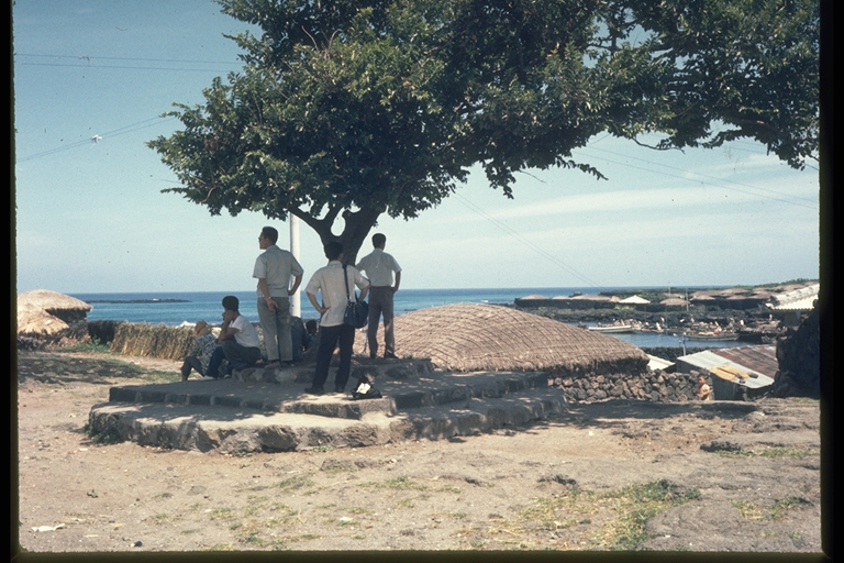 * 개요 : 가옥이 밀집해 있는 마을 입구 폭낭(팽나무) 그늘 아래 댓돌에 마을 사람들과 일본 연구자들이 모여 있다. 바다 수평선과 초가 가옥들, 폭낭과 댓돌, 정박해 있는 어선들과 어우러져 어촌의 정겨운 풍경을 그려내고 있다.