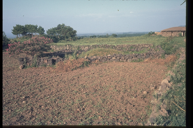 * 개요 : 밭 가운데 산담을 쌓은 묘지가 있고 그 옆에 배롱나무가 심어져 있다. 산담은 말, 소의 방목으로 인한 분묘의 훼손을 막고, 산불이나 병충해를 막기 위하여 쌓았다. 제주도는 흙이 적기 때문에 무덤의 봉분이 바람에 날아가지 않도록 산담을 만들었다고도 한다. 산담에는 ‘시문(출입문)’이 만들어져 있다. 제주 지역의 산담에는 죽어서도 망자의 혼령이 집으로 찾아오기를 바라는 마음으로 ‘시문’을 만들었다. 산담의 출입문의 경우 오른쪽은 남자의 것이고, 왼쪽은 여자의 것이라고 한다. 시문이 없이 산담을 쌓는 경우에는 시문 위치에 해당하는 곳에 돌계단을 만들어 두었다.