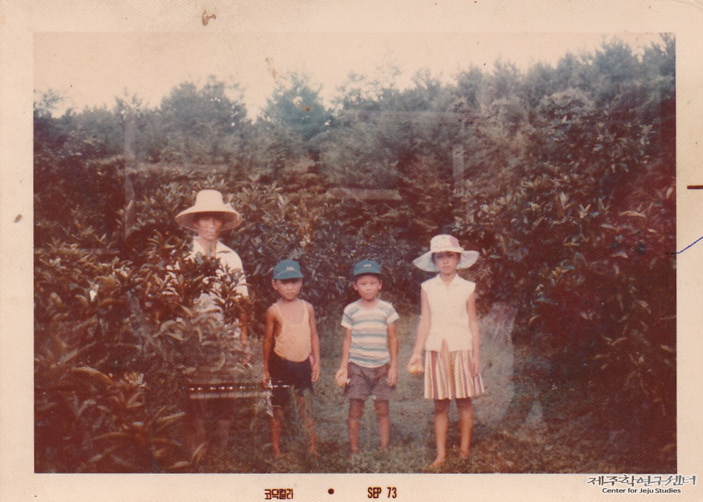 강군자 씨 가족이 경작하던 감귤밭에서 남편과 아들들, 조카가 감귤 나무 사이에서 찍은 사진이다. 복장으로 보아 여름인 듯하고 감귤 따기 체험이라도 한 듯 아이들은 귤을 손에 쥐고 있다.