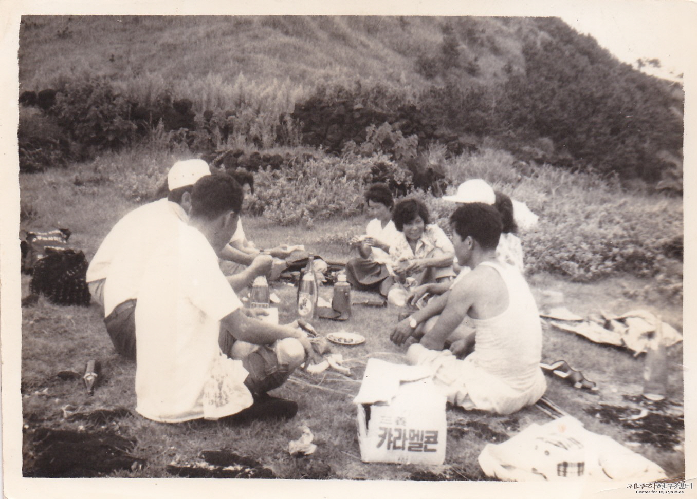 강군자 씨 부부가 여름철 농한기를 맞아 지인들과 함께 인근 오름으로 나들이를 떠나 여가를 즐기는 모습이다. 당시 나들이는 각 가정에서 직접 준비한 음식을 가지고 인근 들판이나 오름, 계곡 등으로 나가 서로 음식을 나눠 먹으며 친목을 다지는 형태가 일반적이었다. 강군자 씨들도 미리 준비해온 고기와 소주 등을 나누며 담소를 즐기고 있다.