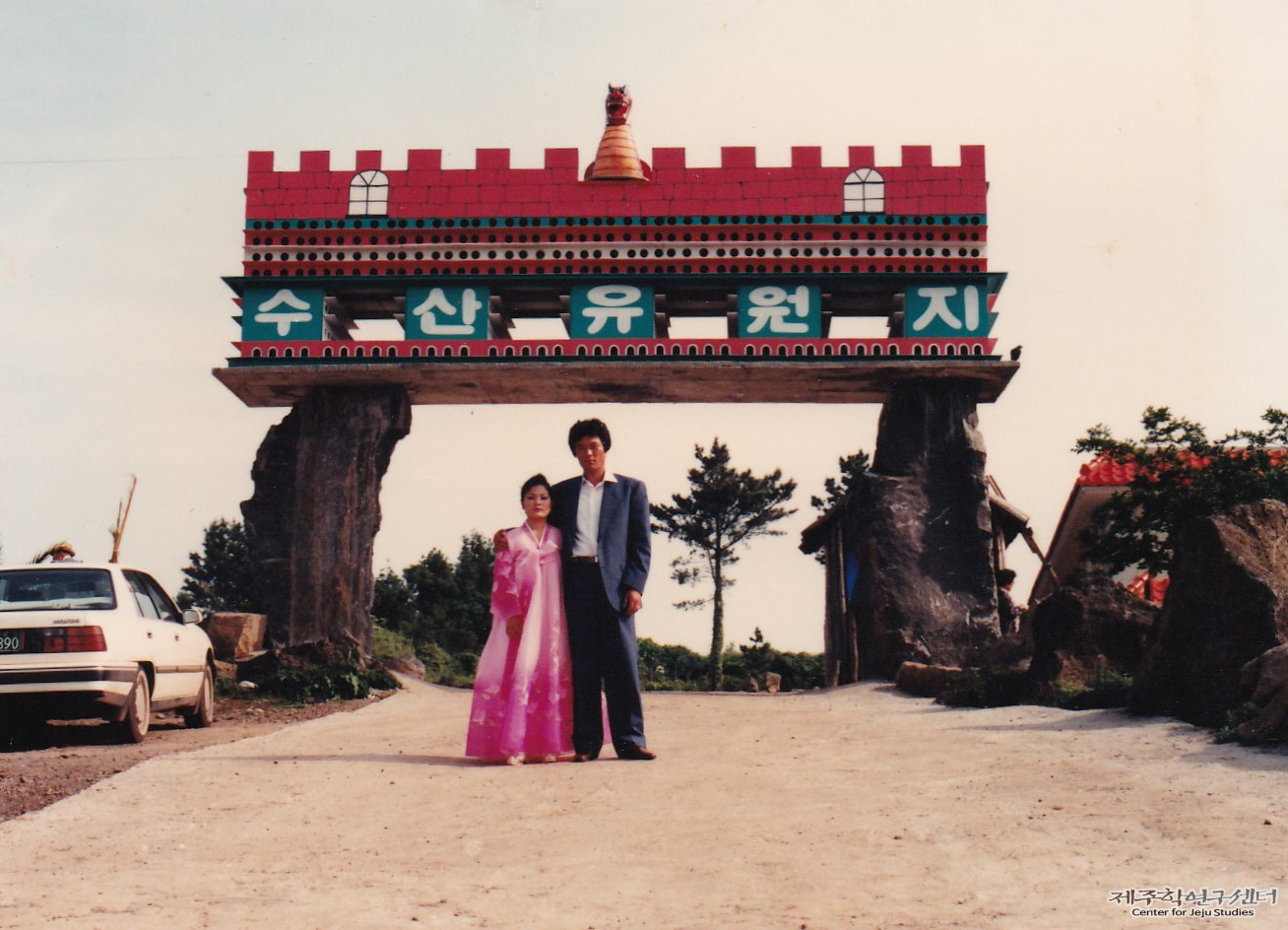 박철성 씨가 약혼식을 마치고 수산유원지에서 찍은 부부 사진이다. 약혼식은 돼지 한 마리를 잡고 신부집에서 친척들만 모여 간소하게 치렀다고 한다. 사진 속 신부는 화사한 분홍색 한복 차림이고 신랑은 양복을 입고 있다. 한편 수산유원지는 1988~89년경 개장하여 2000년대 초반 폐장하기까지 제주도에 있는 휴양 시설이었다. 유원지는 제주도민과 관광객들이 즐겨 찾던 곳이라고 한다.