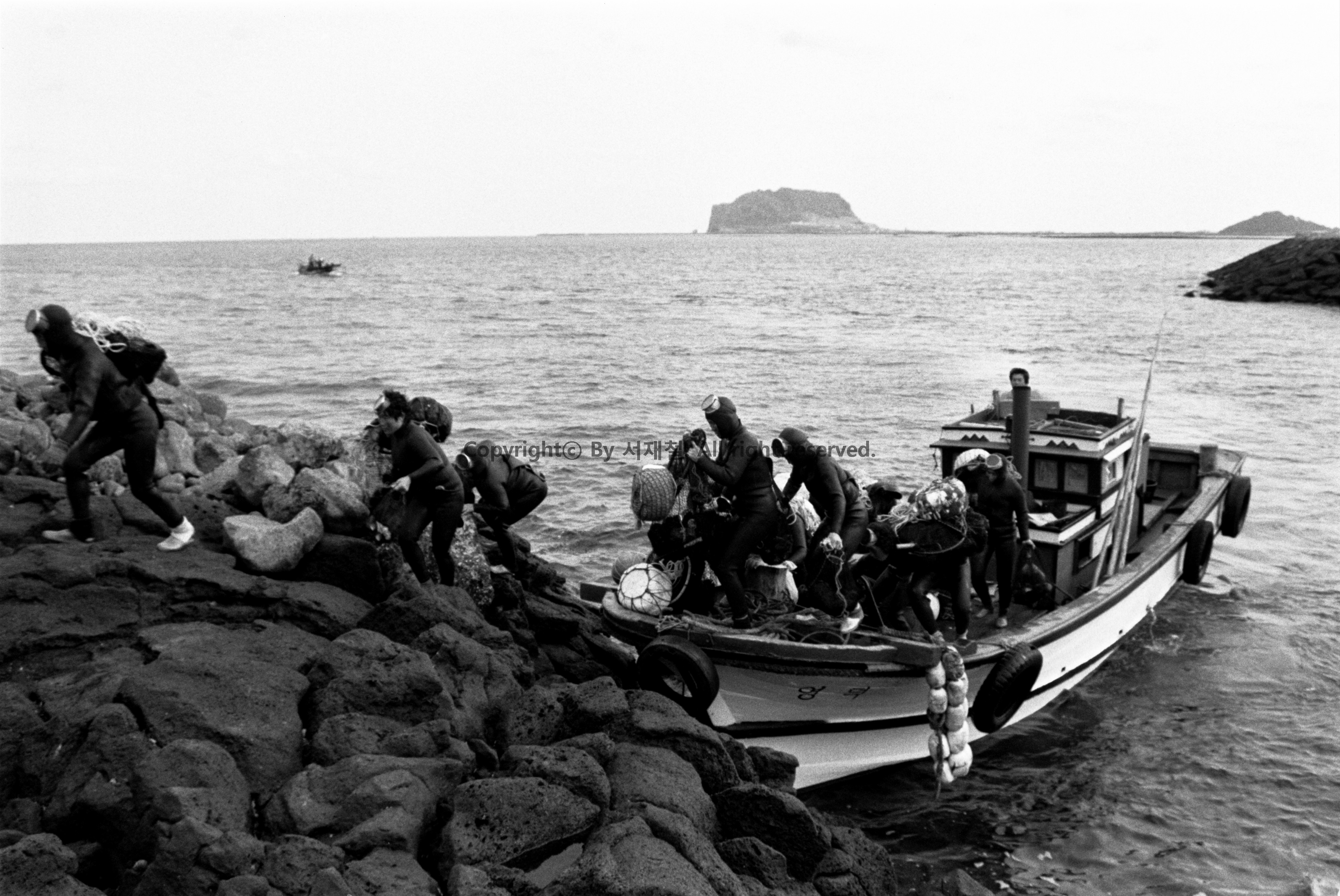 구좌읍 종달리 해녀들이 배를 이용하여 육지에서 멀리 떨어진 어장으로 나가 작업하고 돌아오고 있다.
