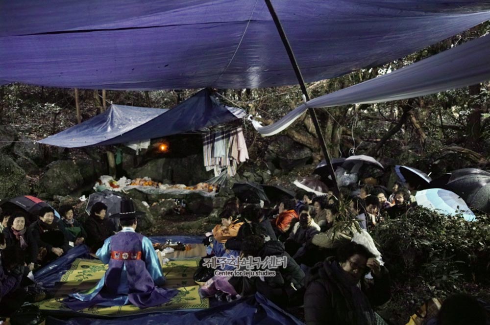 오용부 심방이 가시리 본향 구석물당 제단 앞에 앉아 굿을 하는 모습이다.