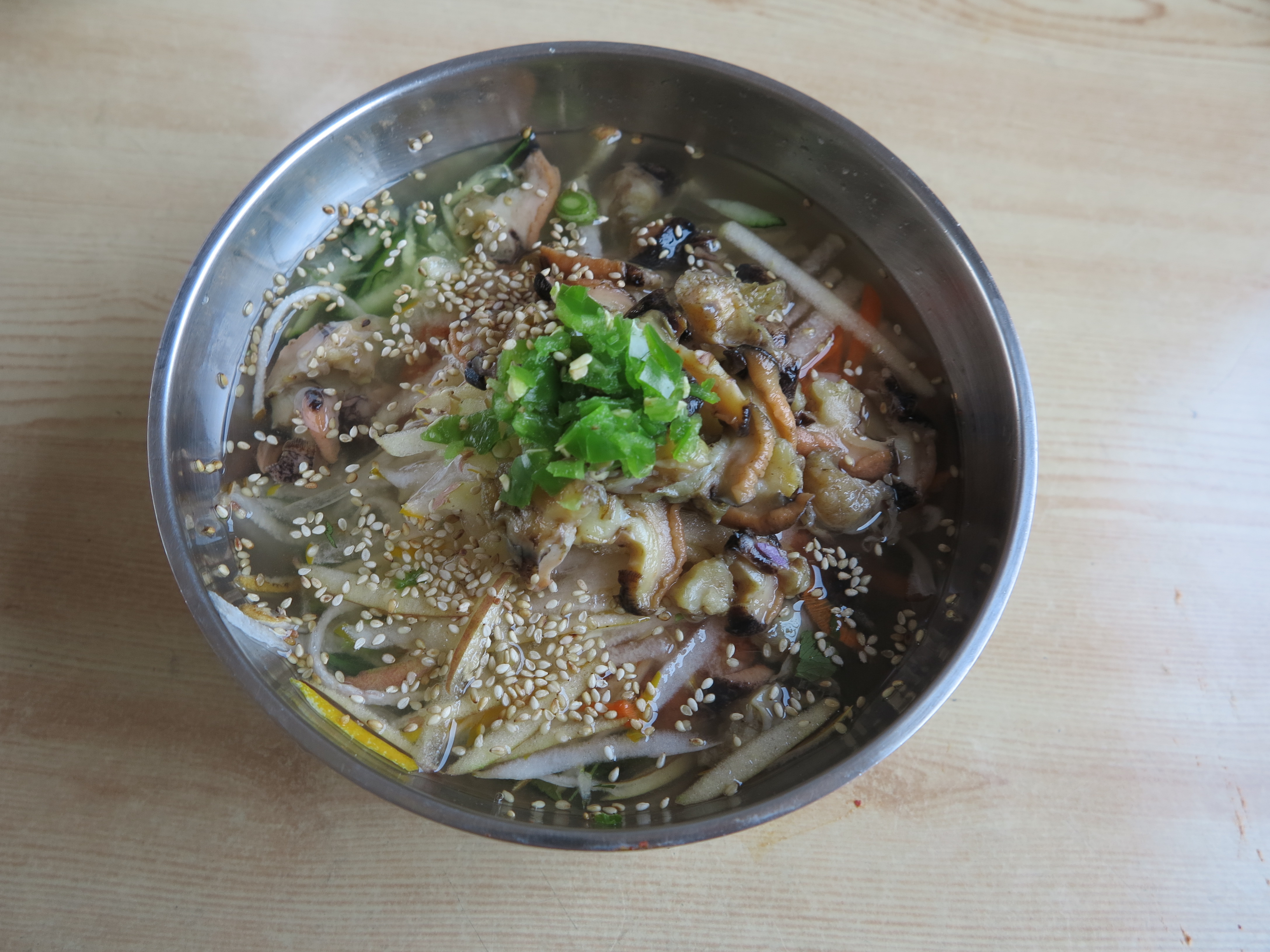 성게, 한치, 문어, 톳, 미역 등 바다의 해산물과 배, 당근, 오이 양파 등의 야채에 고추장과 된장 식초, 깨 등을 넣고 버무린 후 물을 부어서 간을 맞춘다.