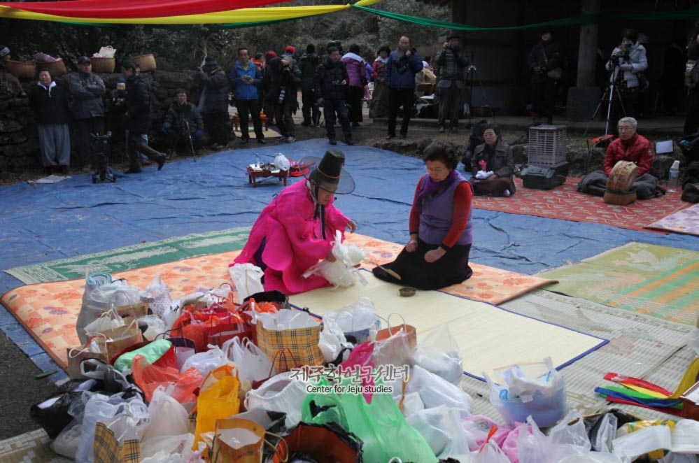 [송당리 마을제] 송당리 본향 웃손당 당오름 백주할망당 신과세제 (2011년) 정태진 심방이 초감제 중 신청궤 제차를 하는 모습