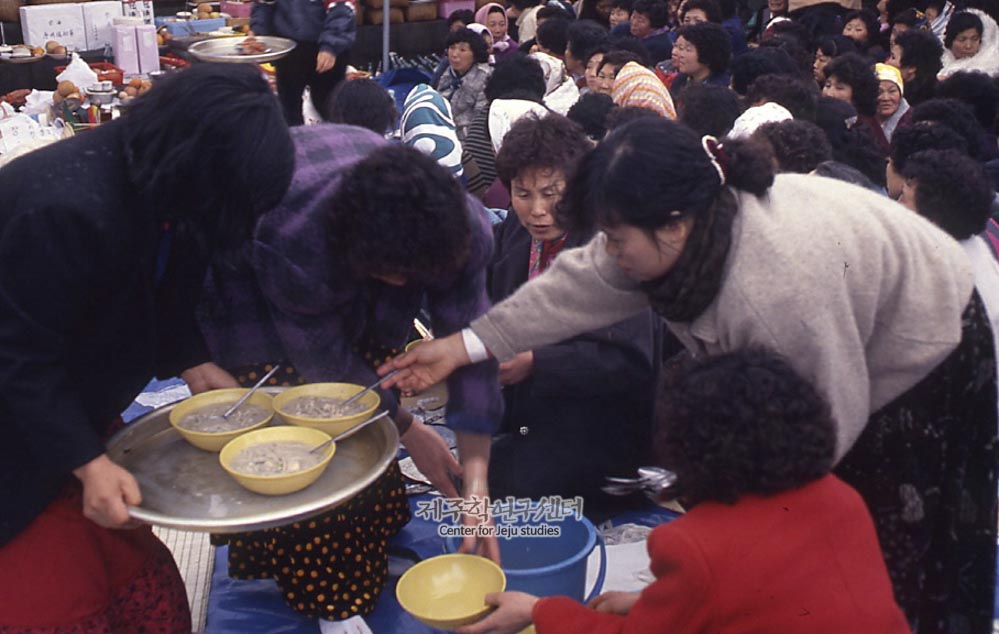 송당리 본향 웃손당 당오름 백주할망당 신과세제- 마을사람들이 꿩메밀칼국수를 그룻에 떠 쟁반에 올리는 모습