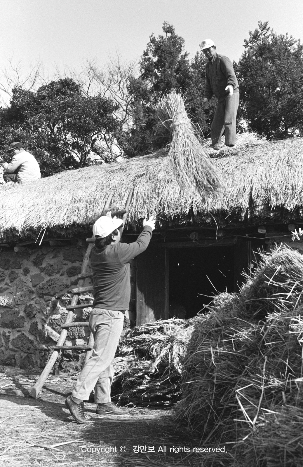 초가는 겨울 북서풍에 안전하기 위해서 띠로 엮는데, 줄을 남드는데는 ' 각단'을 쓴다. 초가를 이는 것은 2년에 한번씩 교체하여야 안전하다. 삼칸 집에는 큰 줄이 30여개, 작은 줄이 100개 정도가 쓰인다. 굵기가 굵고 긴줄은 지붕 상모루의 가로줄로 쓴다.작은 줄은 세로 줄로 사용한다. 동짓달에 큰 줄, 작은 줄을 만들어 외양간에 두었다가 봄이 되면 지불을 이어나간다