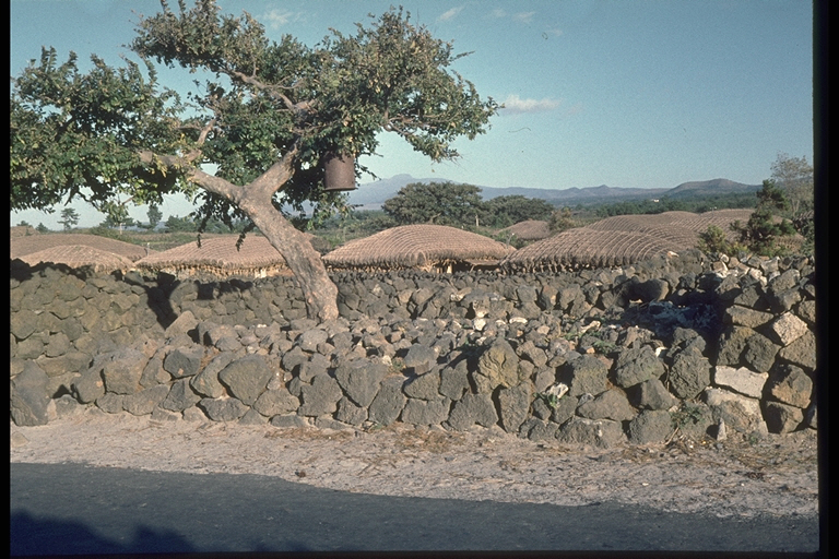 * 개요 : 협재리 일주도로 옆에 돌담으로 둘러싸인 큰 나무와 초가집들이 올망졸망 모여 있다. 큰 나무에는 큰 종이 달려 있는데 어떤 용도로 사용했는지 알 수 없으나, 마을에서 알리고자 하는 사항이 있을 때 종소리를 크게 내서 마을 사람들을 모이게 하지 않았을까 싶다. 가옥이 여러 채 모여 있는 중심지에 큰 나무가 있다. 초가지붕은 단단하게 바둑판 모양으로 새끼줄로 묶여 있고 울담은 초가지붕 바로 밑까지 올려 쌓아 있다. 바닷가 근처 마을이라 바다 바람과 태풍으로 몰아치는 비바람이 더 거세어 탄탄히 울담을 쌓았을 것이다. 마을 풍경 뒤로 한라산이 병풍처럼 펼쳐져 한 폭의 그림 같다.