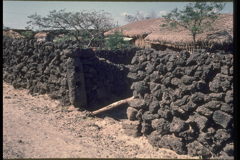* 개요 : 올레길 초가집 입구에 정주석을 세우고 정낭 하나가 놓여 있다. 정낭이 내려져 있어 집에 사람이 있음을 알리고 있다. 이 초가집에는 정주석 구멍이 2개 뚫려 있다. 예전 제주도에서는 문이 없는 대신 양쪽에 구멍 1~5개 뚫은 정주석을 세우고 정낭이라는 나무를 가로로 걸쳐 놓고 집안에 사람의 있고 없음을 알렸다. 정낭 3개가 올려 있으면 주인이 먼 곳으로 외출해서 아무도 없다는 것이고, 2개면 집안에 아이만 있거나 주인이 잠시 밭일을 하러 나갔음을 말한다. 1개가 올려 있으면 주인이 가까운 곳으로 외출하여 곧 돌아올 것임을 의미했다. 이처럼 정낭으로 주인이 어디에 가고 무엇을 하고 있는지 마을 주민들과 소통할 수 있었다. 원래 정주석과 정낭은 원래 소나 말의 출입을 방지했던 기능이 있었다. 후에 주인의 외출 등을 표시하는 의미를 지니게 되었다고 한다.