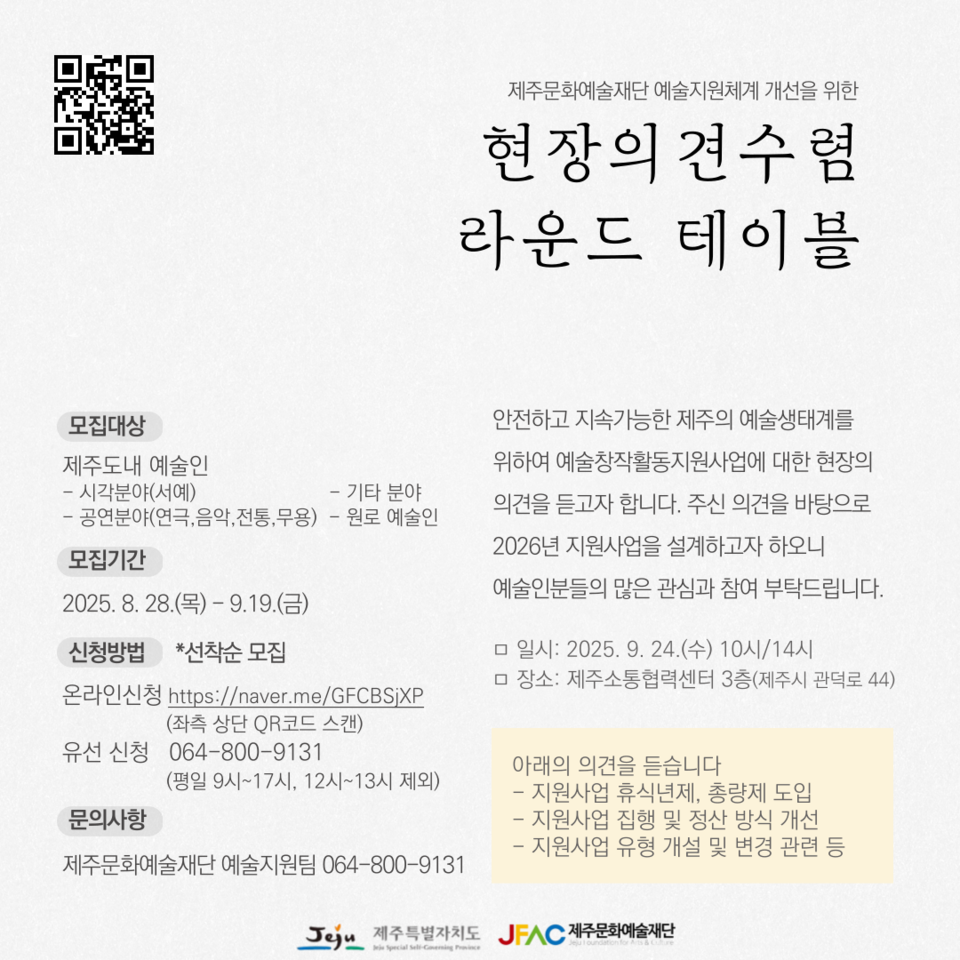 제주문화예술재단(이사장 김석윤, 이하 재단)은 24일(수) 오전 10시와 오후 2시 제주소통협력센터에서 ‘예술지원체계 개선을 위한 현장 의견수렴 라운드테이블’을 개최하면서, 19일까지 참가자를 모집한다.