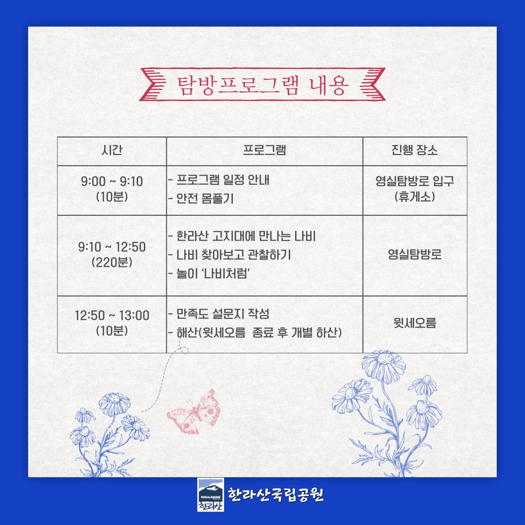 고종석 세계유산본부장은 “나비 관찰을 통해 정서적 안정감을 얻고 한라산을 새롭게 바라보는 시간이 되길 바란다”며 “한라산 탐방 프로그램은 11월까지 이어질 예정이니 많은 관심과 참여를 부탁드린다”고 말했다.