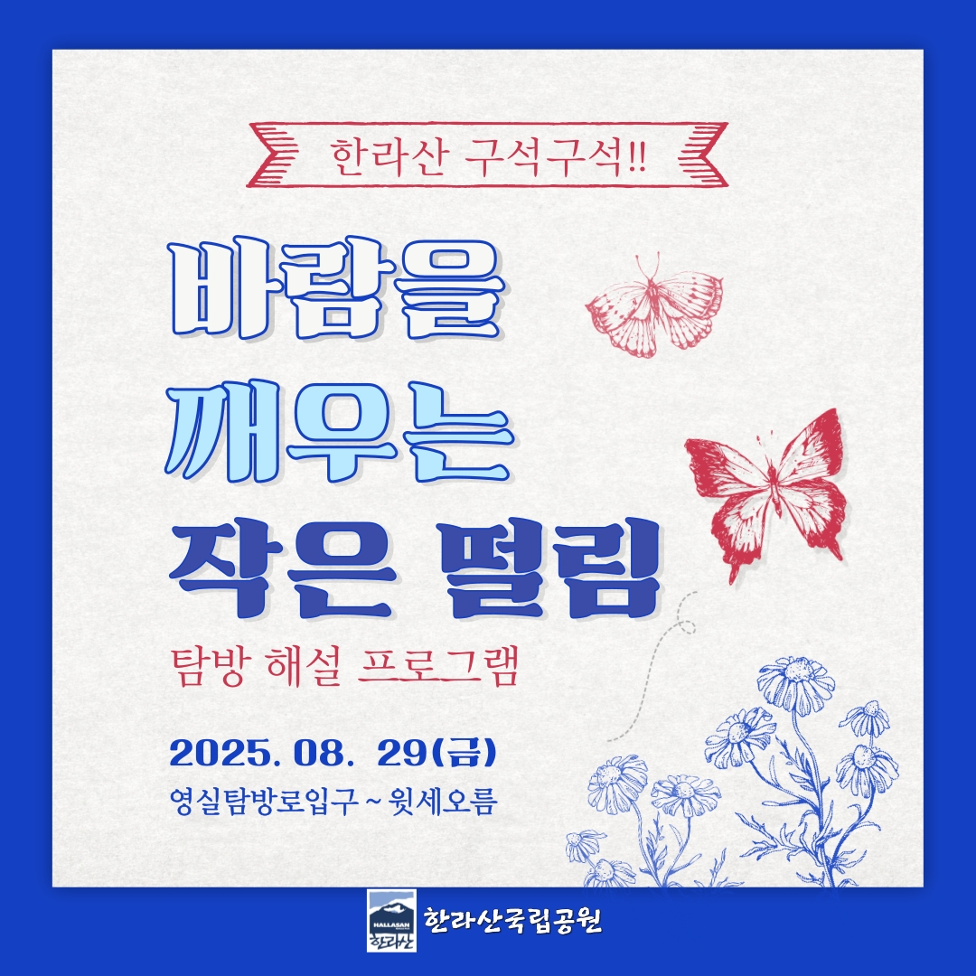 네 번째 ‘바람을 깨우는 작은 떨림’은 영실탐방로 입구에서 윗세오름까지 3.7km 구간을 걸으며, 고지대에 서식하는 나비를 찾아 관찰하는 탐방 프로그램이다. 참가자는 자연환경해설사의 안내와 해설을 통해 한라산의 다양한 생태와 매력을 깊이 체험할 수 있다.