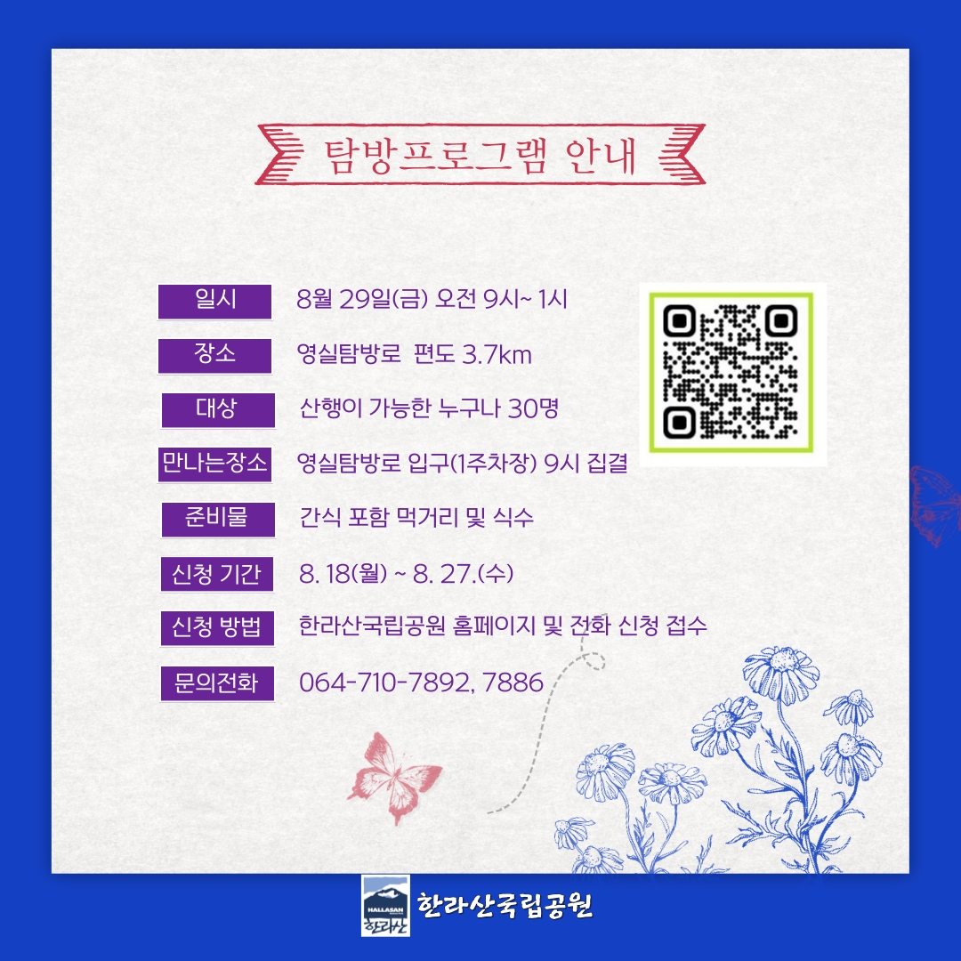 프로그램 신청은 18일부터 한라산국립공원 누리집과 유선 전화를 통해 선착순 30명을 모집한다. 프로그램에 대한 자세한 내용은 한라산국립공원 누리집( https://www.jeju.go.kr/hallasan/index.htm )에서 확인할 수 있다. 성판악탐방안내소(064-710-7892, 7886, 7890)로도 문의하거나 신청할 수 있다.