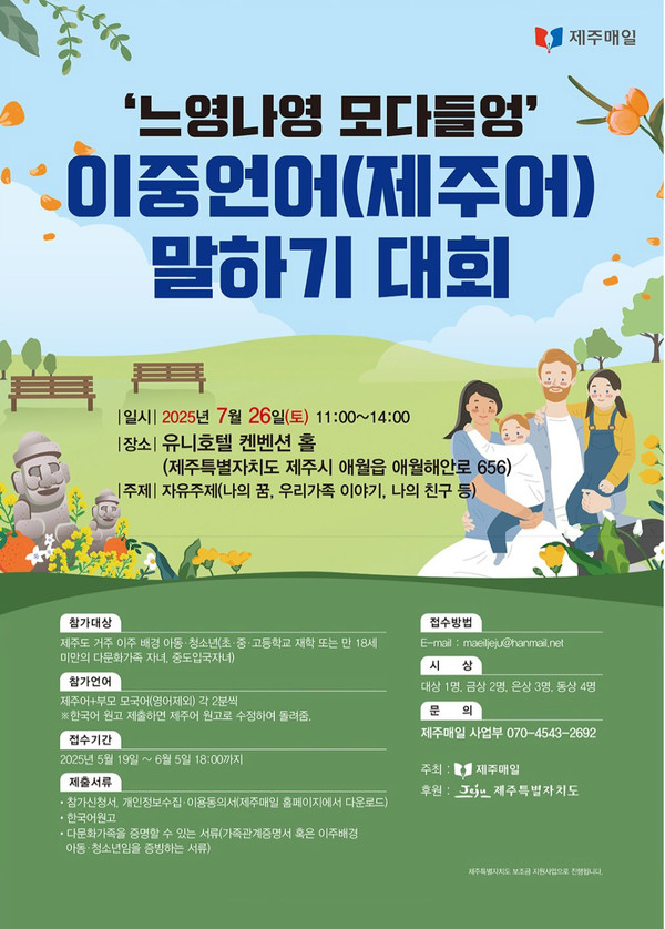 ㈜제주매일(대표이사 고장원)은 제주특별자치도의 후원을 받아 오는 26일 오전 11시부터 제주시 애월해안도로에 위치한 유니호텔 컨벤션홀에서 ‘느영나영 모다들엉 이중언어(제주어) 말하기 대회’를 개최한다.