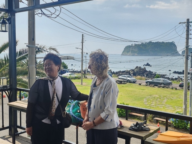 잉거 안데르센 UNEP 사무총장과 장영미 제주 해녀협회 부회장이 4일 제주 서귀포의 한 카페에서 면담하고 있다. (사진제공=제주도)