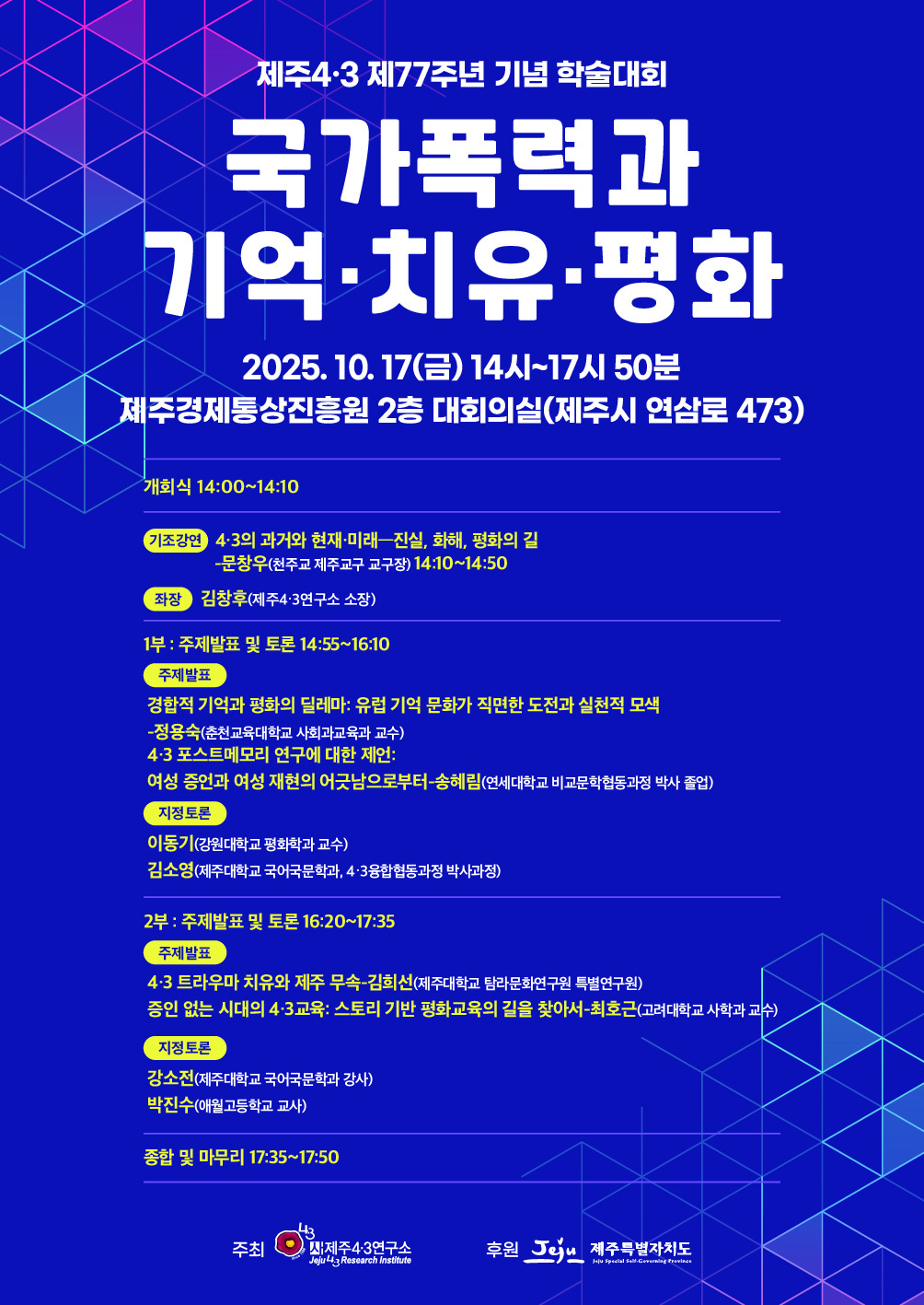 학술대회는 김창후 제주4.3연구소장이 전체 좌장을 맡으며, 문창우 천주교 제주교구 교구장의 기조강연으로 시작된다. 문창우 주교는 ‘4.3의 과거와 현재, 미래–진실.화해, 평화의 길’을 주제로 4.3의 역사적 의미와 평화 실현의 방향을 제시할 예정이다.