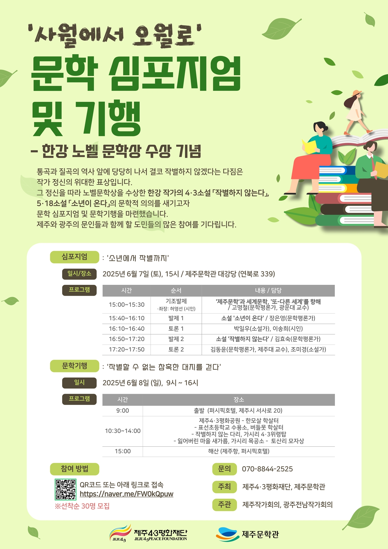 참가는 제주·광주 지역 문인 뿐만 아니라 도민들도 참여할 수 있다. 일반 도민은 30명을 선착순으로 모집한다. 사전 신청은 온라인( https://naver.me/FW0kQpuw )으로 받는다.