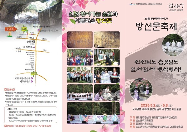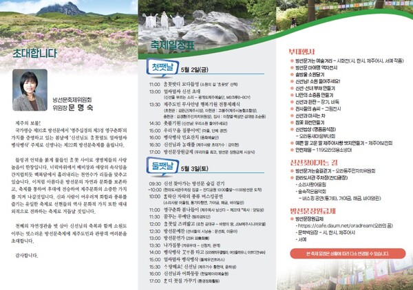 오라동자연문화유산보전회(회장 양국남)가 주최하고 오라동방선문축제위원회(위원장 문명숙)가 주관하는 ‘제22회 방선문 축제’가 5월 2일과 3일, 이틀간 방선문 일대에서 진행된다.