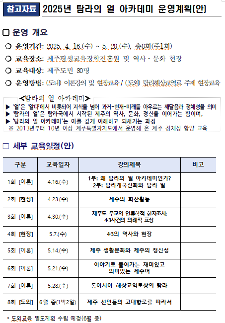 김양보 제주도 문화체육교육국장은 “탐라의 얼 아카데미는 제주의 역사와 문화를 깊이 있게 이해하고 제주인의 정체성을 새롭게 인식하는 의미 있는 기회가 될 것”이라며 “도민들이 스스로 제주다움을 되새기며 지역에 대한 자긍심을 키우는 계기가 되길 바란다”고 말했다.