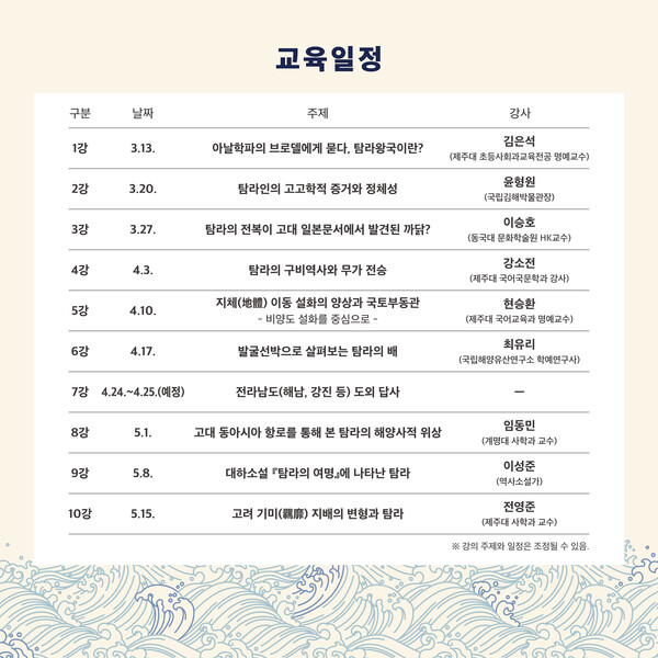 오는 3월 13일 1강 아날학파의 브로델에게 묻다, 탐라왕국이란?(김은석 제주대 초등사회과교육 명예교수)을 시작으로 ▲3월 20일 2강 탐라인의 고고학적 증거와 정체성(윤형원 국립김해박물관장) ▲3월 27일 3강 탐라의 전복이 고대 일본문서에서 발견된 까닭?(이승호 동국대 문화학술원 HK교수) ▲4월 3일 4강 탐라의 구비역사와 무가 전승(강소전 제주대 국어국문학과 강사) ▲4월 10일 5강 지체(地體) 이동 설화의 양상과 국토부동관, 비양도 설화를 중심으로(현승환 제주대 국어교육과 명예교수) ▲4월 17일 6강 발굴선박으로 살펴보는 탐라의 배(최유리 국립해양유산연구소 학예연구사), 7강 전라남도 도외 답사(예정) ▲5월 1일 8강 고대 동아시아 항로를 통해 본 탐라의 해양사적 위상(임동민 계명대 사학과 교수) ▲5월 8일 9강 대하소설 '탐라의 여명'에 나타난 탐라(이성준 역사소설가) ▲5월 15일 10강 고려 기미(羈靡) 지배의 변형과 탐라(전영준 제주대 사학과 교수) 등의 강의가 진행될 예정이다.