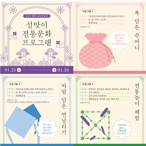 제주교육박물관은 오는 25일과 26일 이틀간 복주머니 만들기와 연날리기 체험 프로그램을 운영한다. 참가자들은 복주머니를 만들어 새해 복을 기원하고, 소망을 담은 연을 날리며 가족과 함께 뜻깊은 시간을 보낼 수 있다.
