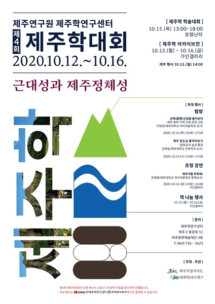 제주도가 주최하고 제주연구원 제주학연구센터(센터장 김순자)가 주관하는 제4회 제주학대회가 '근대성과 제주 정체성'을 주제로 이달 12~16일 열린다.