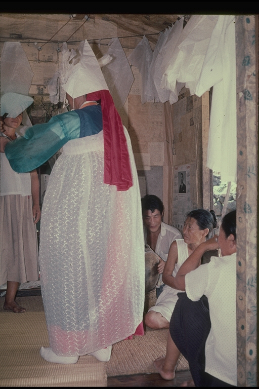 * 개요 : 송낙을 쓰고 ‘군눙치메’를 걸친 심방이 손에는 신칼과 요령을 들고 흔들면서 북에 장단 맞춰 격렬하게 춤을 추고 있다. 군눙치메는 퀘지 위에 여성의 한복 치마를 이용하여 가사(袈裟)처럼 둘러 걸치는 것을 말한다. 일월조상을 청하여 즐겁게 놀리는 제차를 할 때 입는다. 더운 여름에 방안에서 굿춤을 추려니 무척 더운가 보다. 한 여자가 심방에게 부채를 흔들고 있다. 천정에는 줄을 쳐서 기메를 많이 매달아 놓았다. 기메는 무속의례에 쓰이는 무구(巫具)의 하나로, 수많은 형태가 있는데 대부분 종이를 오려서 다양한 모양으로 만든다. 기메는 쓰이는 용도에 따라 성격도 분류할 수 있다. 대표적인 것이 신의 모양을 구체적으로 나타내는 신체 상징물이다. 이외에 제청의 장식물과 제차를 진행하는 보조 수단으로서의 기능도 가지고 있다.