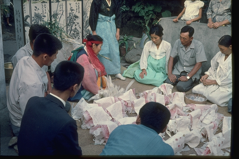 * 개요 : 심방이 가족들 앞에서 신칼점을 보는 장면인 것 같다. 신칼점은 심방이 무의를 행할 때 신의를 알고자 하는 사항을 물으면서 신칼 두 개의 끈을 쥐고 지면에 던져놓아 그 칼날의 방향을 보고 판단하는 것을 말한다. 어떤 괘가 나오느냐 따라 길흉을 판단하여 좋은 괘가 나오면 한 번으로 끝나지만 나쁜 괘가 나오면 심방이 좋은 괘가 나오도록 빌면서 신칼을 다시 던진다. 좋은 괘가 나오기를 바라는 마음으로 가족들이 심각하게 바라보고 있다.