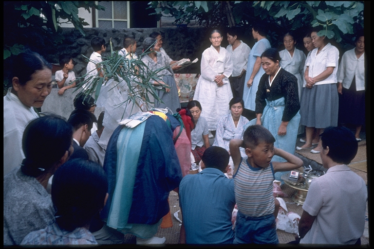 * 개요 : 굿판에 사람들이 많이 모여 있다. 앉아 있는 사람들은 가족들이나 친지들이 아닐까 싶다. 하얀 저고리 치마를 입고 서서 지긋이 바라보는 할머니는 이 집의 어머니인 듯하다. 얼굴에는 근심이 가득하다. 어떤 연유로 굿을 하는지 모르나 가족들의 마음은 굿을 행함으로써 모든 근심 걱정이 사라지기를 바라고 있을 게다. 아이들의 참여가 인상적이다. 굿이 끝나고 나면 제물들을 먹을 수 있어서 참석한 것일까. 예전에 굿이 끝나면 제물들을 나눠서 먹었고, 또 굿에 오는 친지들이 돌레떡을 만들어 가져오기도 했었다. 이러한 떡이나 제물들은 참여했던 사람들이 음복하면서 굿을 행했던 바람을 이루어지기를 함께 기원했다.
