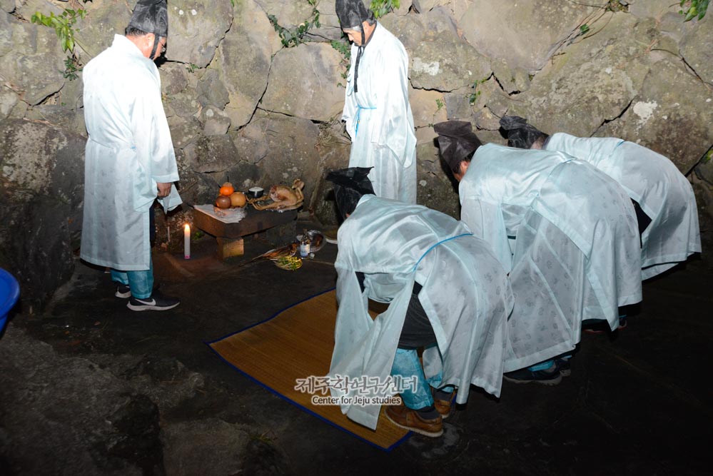 [장면설명] 멀당 [공통설명] 리사제는 포제라고도 한다. 제주특별자치도 전역에 분포되어 있는 유교식 마을 제사의 일반적인 명칭이다. 정월에 희생으로 소‧돼지 등 가축을 잡아 하늘에 제사를 지내는 것으로 생산물의 풍요와 가족의 무병장수를 기원한다. 남자 유지들이 제관이 되어 유교적 의례 방식에 따라 진행하는 마을 제사이다.